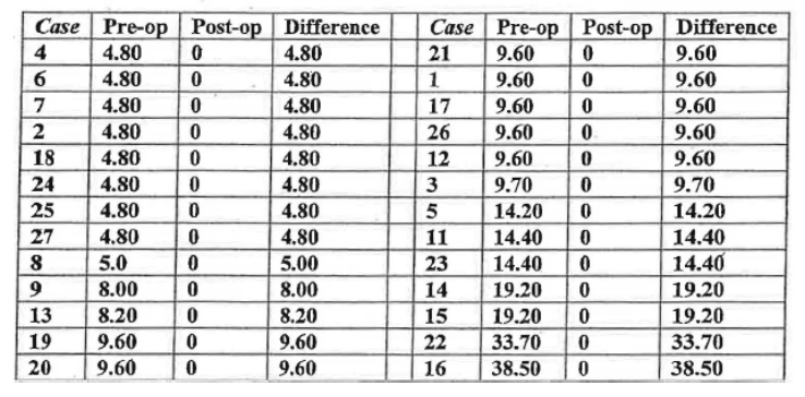 Table 2 and Figure 1 represent a significant change on the VAS following surgical stabilization. LBP and pelvic pain that was present pre-operatively decreased in most cases following surgical stabilization. Surgical stabilization was shown to increase the stiffness of the SIJ in every case and therefore can be presumed to be the reason for a decrease in pain as recorded on the VAS post-surgically.