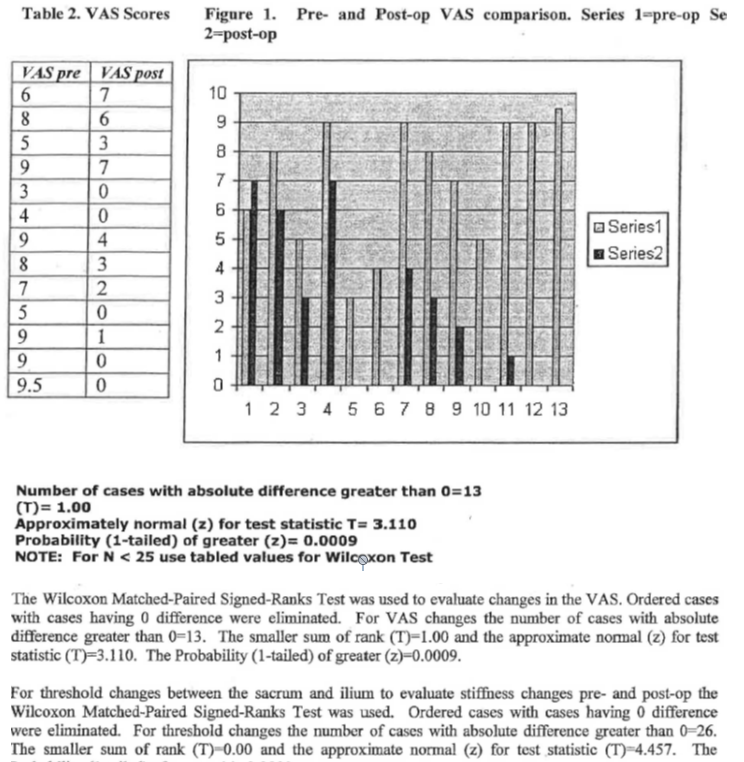 Different levels of stiffness were measured in Threshold Units (TU) and observed before and after the specified surgical intervention. Table 1 shows the difference in threshold levels on the ilium and sacrum of each side of the SI joint pre- and post-surgical stabilization. Table 2 compares scores on the Visual Analog Scale (VAS) pre- and post-op a 6 weeks. Figure 1 shows changes from series 1 (pre-op) to series 2 (6-weekspost-op).